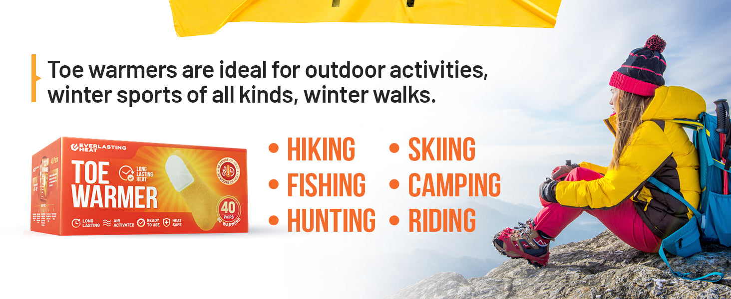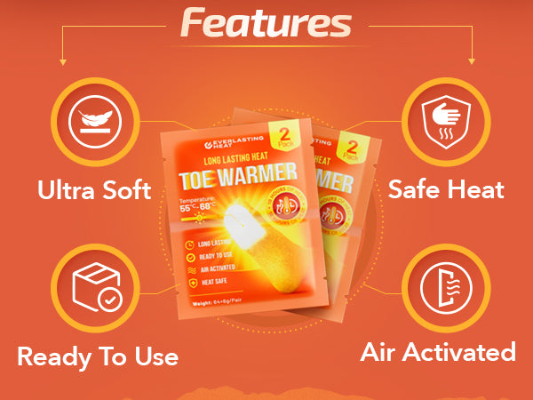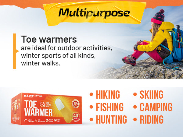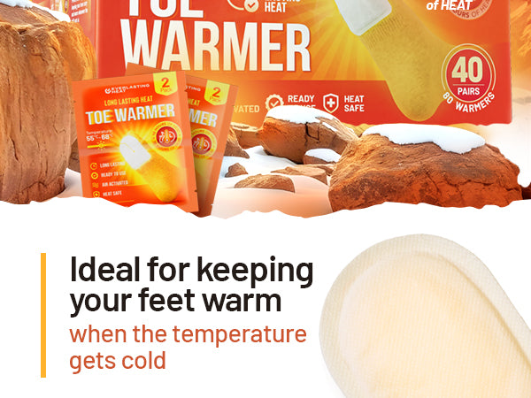 - LONG-LASTING HEAT - These foot warmers for feet provide up to 10 hours of continuous warmth, perfect for outdoor activities in chilly weather. Keep a toe warmer in your shoes or boots for steady, soothing heat in the cold.